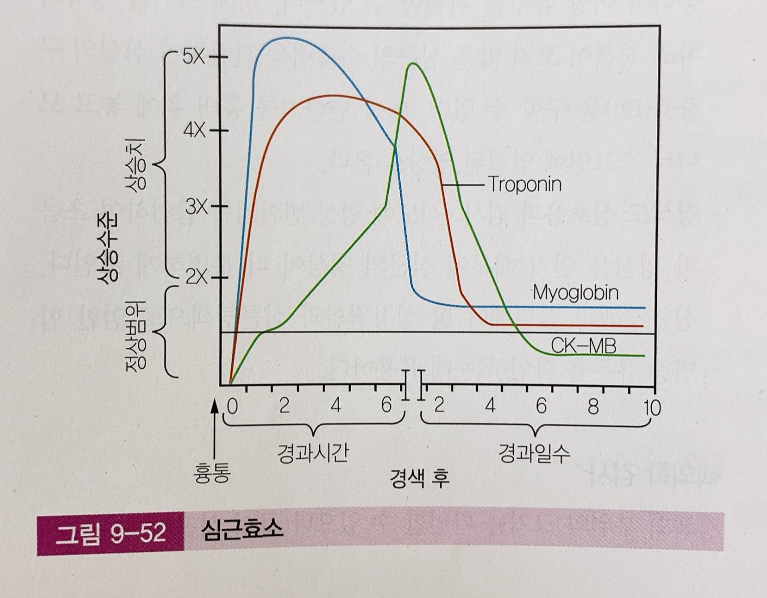 심근 효소 별 상승 시간을 정리하면 위 그래프와 같습니다.