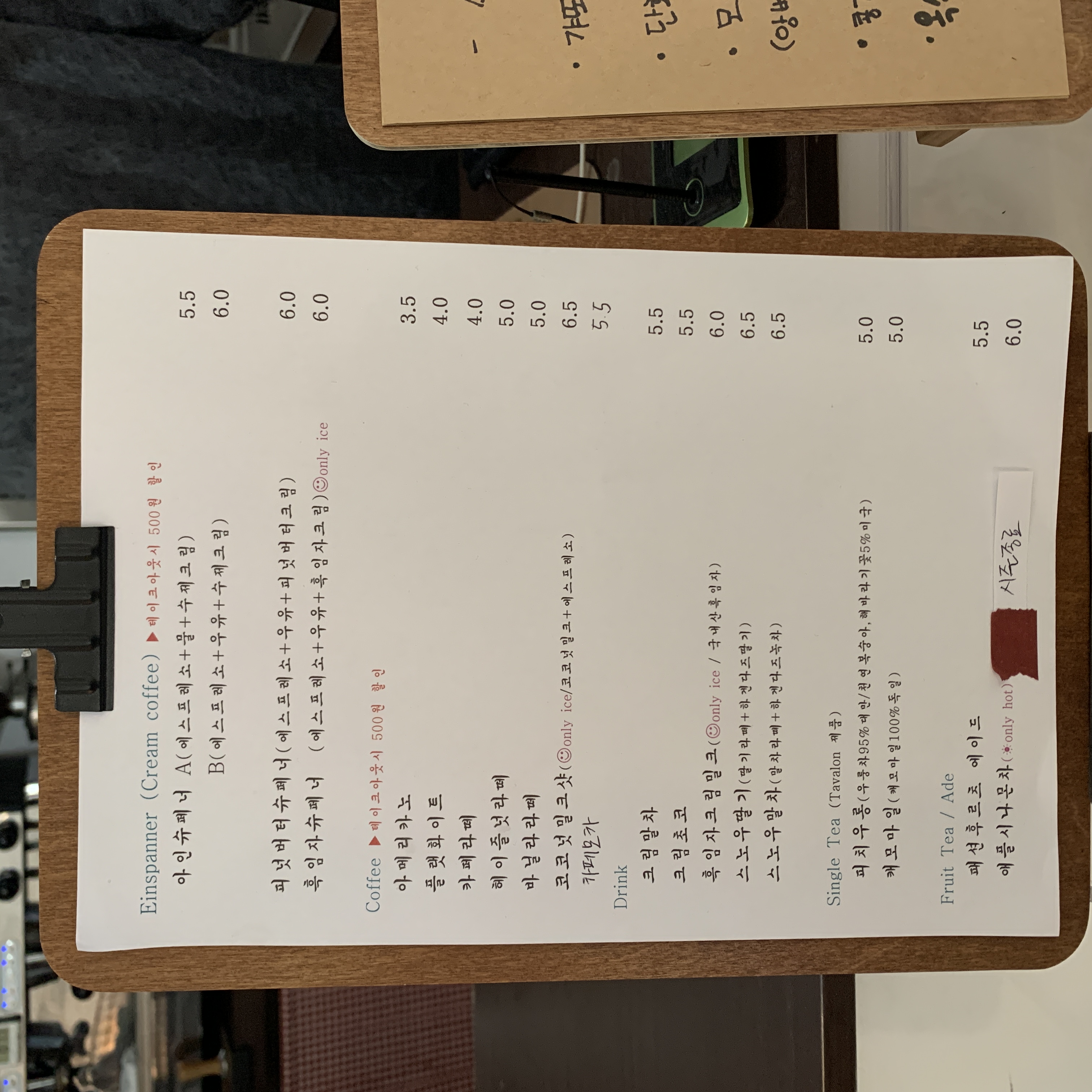 아인슈페너와 커피 메뉴는 테이크 아웃 시 500원을 할인해준다고 합니다.